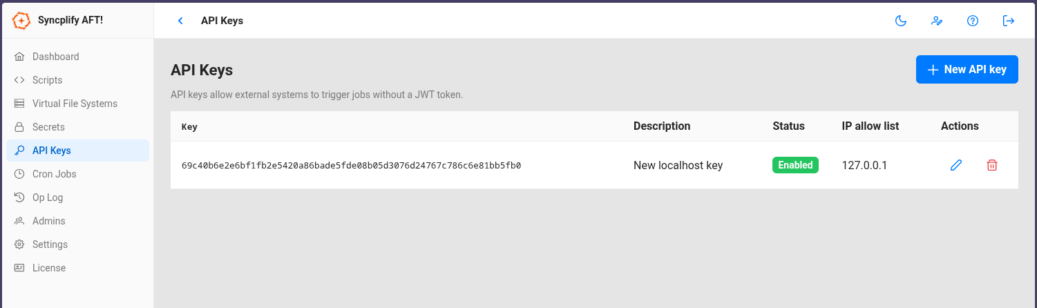 Create an API key in the AFT! web UI under Settings > API Keys. Make sure the key's IP allowlist includes the machine you will be calling from. For calls from the same machine, 127.0.0.1 is sufficient.